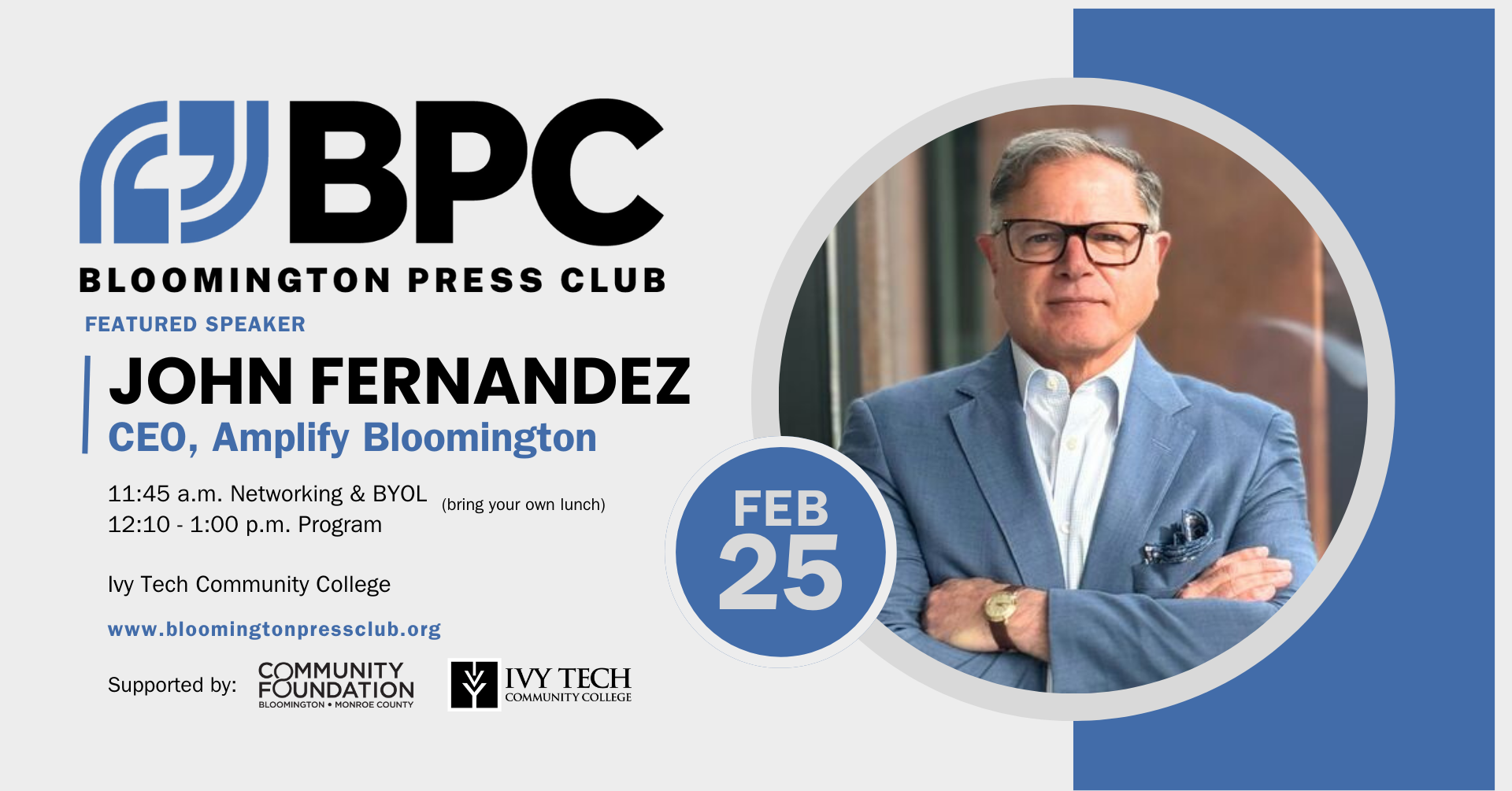 Our next meeting will be on Wednesday, February 25. Our featured speaker will be John Fernandez, CEO of Amplify Bloomington. Guests are welcome!